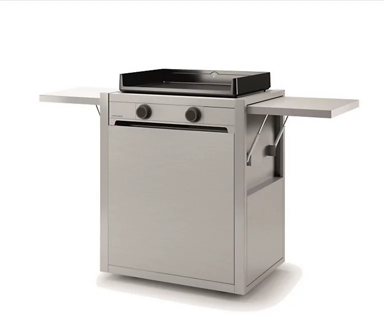 Support intégré à l’arrière pour poser le capot. Tablettes rabattables équipées de vérins hydrauliques. 4 roues pivotantes (2 avec freins et 2 sans freins). En inox
