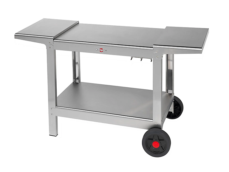 Chariot Plein Air Krampouz en inox, pour planchas doubles avec tablettes rabattables et amovibles. Dimensions : 140 x 59 x 85 cm. Plan de travail : 76 x 48 cm